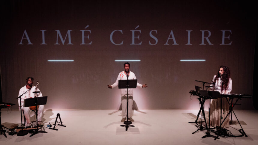 Le spectacle se construit sur des échos : ‘Aimée’ rappelle ‘Aimé’, Adama est ‘Adam’, le premier homme qui est aussi le dernier, et qui est encore l’interprète présent devant son public. Les voix de tous se prolongent, se répondent et se confondent. Adama Diop évoque un « rapport presque radiophonique à dire de la littérature ». Sur scène, Adama Diop porte un costume brodé de fleurs rouges et déclame dans un décor minimaliste, où la nature reprend progressivement ses droits. Il parle pour le végétal menacé, pour les espèces animales disparues, et la poésie perdue.